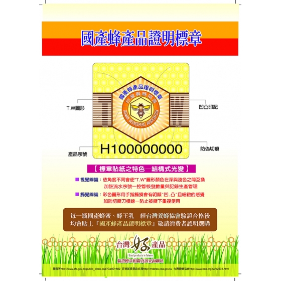 109年国产优质龙眼蜂蜜评鑑头等奖。龙眼蜂蜜是龙眼花朵内的花蜜,经蜜蜂採集酿制而成,蜜色呈琥珀色,质地晶莹滑润,香甜可口,广为国人所喜好,为不可多得的珍品。
