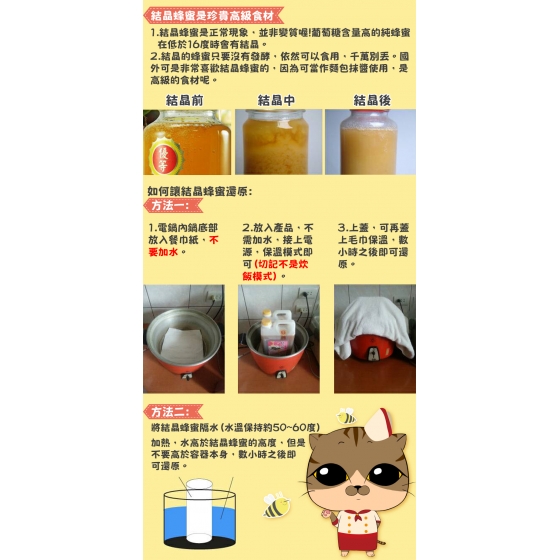 先将蜂蜜瓶盖打开后,隔水加热或浸泡于热水中,待结晶体溶解后,便可沖调饮用。